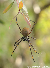 La néphile à toile d’or porte bien son nom ! Cette grosse araignée tisse une toile dorée très résistante, souvent au milieu des sentiers. C’est la femelle que vous verrez le mieux, le mâle vit sur la même toile mais est beaucoup plus petit. D’autres petites araignées argentées ou dorées peuvent aussi habiter sur la toile de la néphile, ce sont des argyrodes.