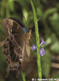 Le très joli papillon bleu, que l’on rencontre assez fréquemment en forêt sèche, en forêt humide et dans tous les milieux intermédiaires, est reconnaissable par la couleur bleu vif de ses ailes, bordées de larges bandes noires. La partie postérieure des ailes se caractérise par une petite excroissance.