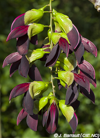 C’est une liane endémique rare, connue uniquement sur deux localités du Sud de la Grande Terre, à La Foa et Dumbéa, et classée « En danger critique d’extinction » sur la liste rouge de l’UICN. Son intérêt horticole n’est plus à démontrer. La liane donne de belles fleurs pourpre foncé, qui se présentent en inflorescences tombantes, à mettre en valeur en tonnelle ou pergola.