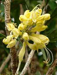 Ce petit arbre ou arbuste lianescent est endémique. Sa floraison est remarquable, et prend des teintes blanc jaunâtre à jaune vif. Ses fleurs forment une belle inflorescence qui attire les oiseaux, abeilles, papillons et fourmis. C’est une plante fréquemment utilisée en horticulture et qui l’est de plus en plus en aménagement paysager.